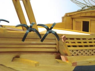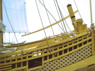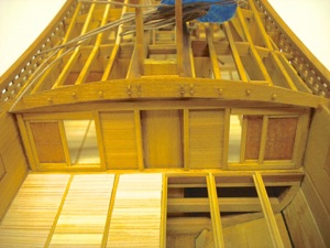 The kit relies heavily on laser-cut parts, which works very well for a ship of such unusual design. The bulk of the wood used is hinoki, which is a very aromatic cypress native to Japan. Because of its very light color, I chose to use a custom mix of wood dyes to give the model it’s color. The hull is painted following traditional pattern based on photos of replica vessels and contemporary drawings of similar vessels.