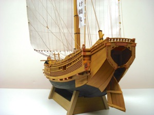The Higaki Kaisen (hee-gah-kee-kah-ee-sen) is a regional variation of a type of ship referred to as a Bezaisen (beh-zah-ee-sen) by sailors and ship owners, but they were most commonly referred to as Sengoku Bune (sen-goh-koo-boo-ney), or 1000 koku ship – A koku being the amount of rice needed to feed one person for a year.